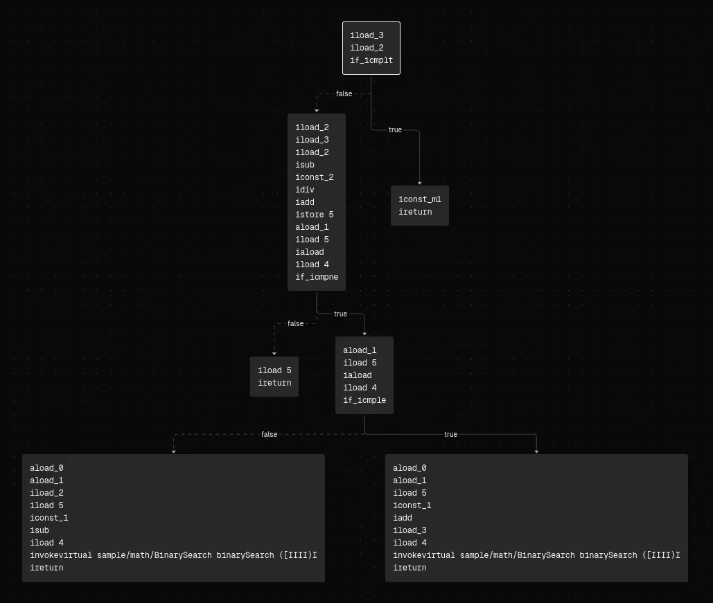 Section titled “Control flow”The control flow graph visualizes bytecode execution in a method using a top-to-bottom flow diagram.